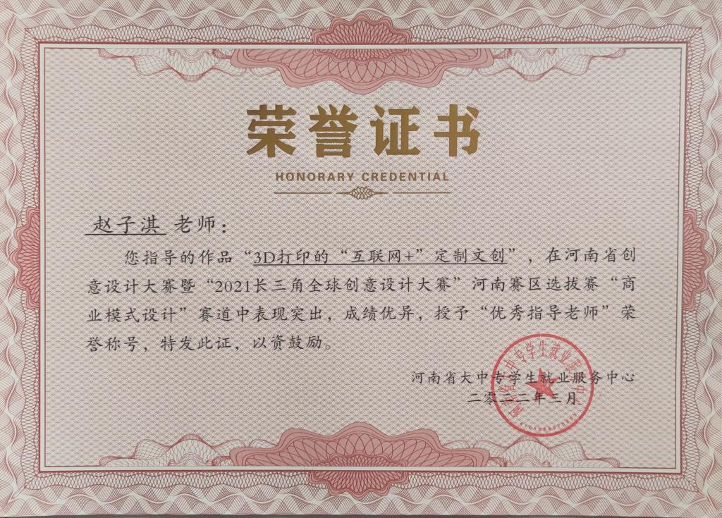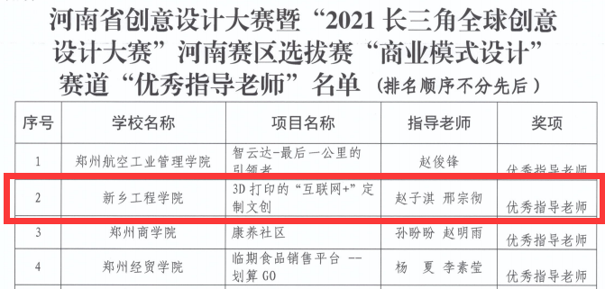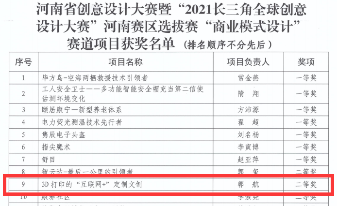 根据大赛安排,全省参赛高校86所,参赛作品2200余项,15000余名创意创新创业类人才参赛。按照“长三角全球创意设计大赛”相关评审要求,经过作品申报、资格审查、高校评审推荐、线上复评、线下决赛,最终我院3D打印的“互联网+”定制文创项目在“商业模式设计”赛道中荣获二等奖,由项目负责人郭航带领两名团队成员完成,其中赵子淇和邢宗彻两名老师被评为“优秀指导老师”。