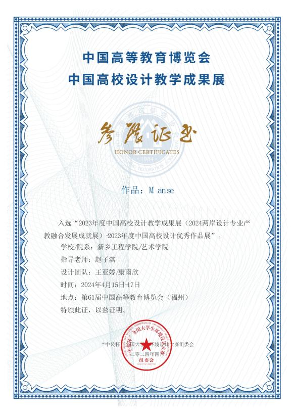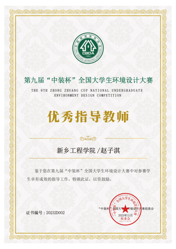 值得一提的是,大赛组委会还为我艺术学院以及两位同学颁发了参展证书,以表彰他们的卓越表现。此外,赵子淇老师和郭蕾老师还荣获了第九届中装杯优秀指导教师称号,赵子淇老师更是被聘任为第十届“中装杯”全国大学生环境设计大赛执行委员会委员,这充分证明了我院在环境设计领域的专业实力和影响力。