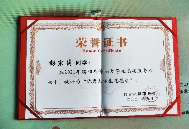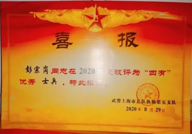 彭宗岗,男,来自艺术学院环设181班,是一名中共预备党员,2018年9月-2020年9月曾服役于中国人民武装警察部队上海市总队执勤某支队。服役期间训练认真,作风纪律严谨,训练认真,利用自己学校所学专业,负责连队的文化宣传工作,2020年获得优秀“四有”军人并嘉奖一次。退伍后继续发扬军人本色,在防汛抗疫中依然保持着召之即来,来之能战,战之必胜的优良作风,彰显了退伍军人的责任与担当。