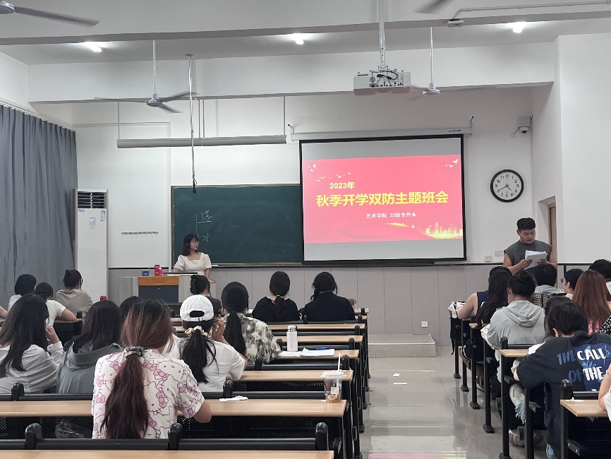 为提升学生抵制非法宗教能力,进一步构建和谐校园。9月11日下午,艺术学院2022级专升本各班级在学院楼B413召开2023年秋季开学双防主题教育班会, 2022级专升本全体同学参与,班会由辅导员郭跃雪主持。