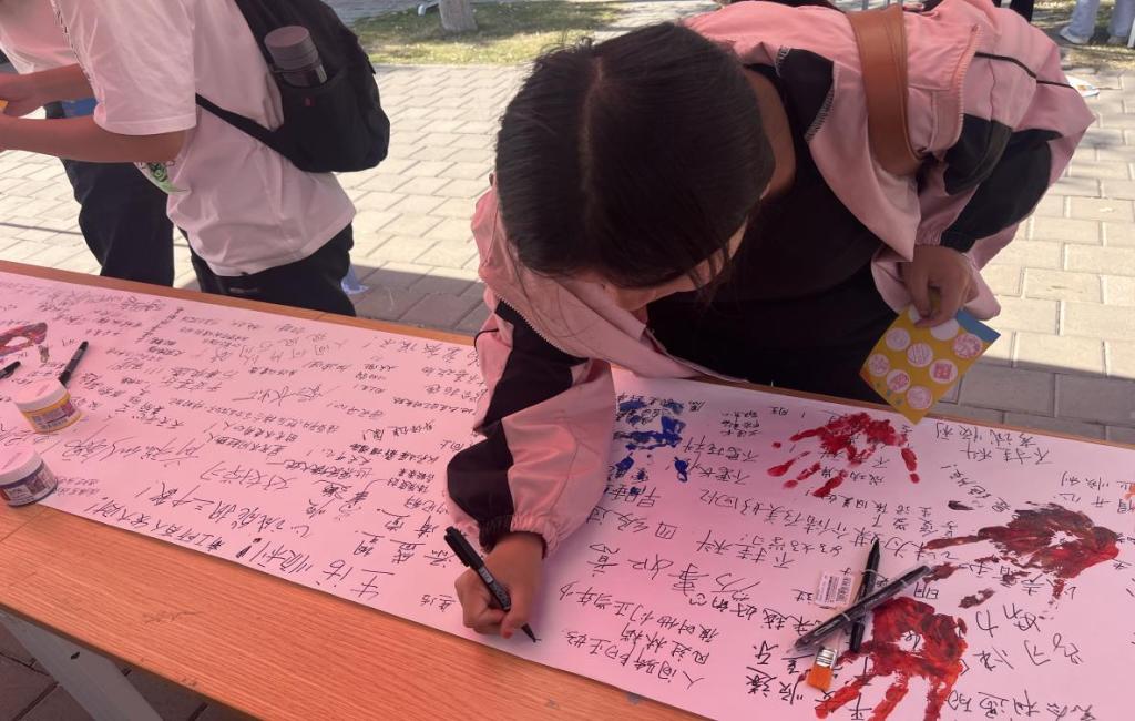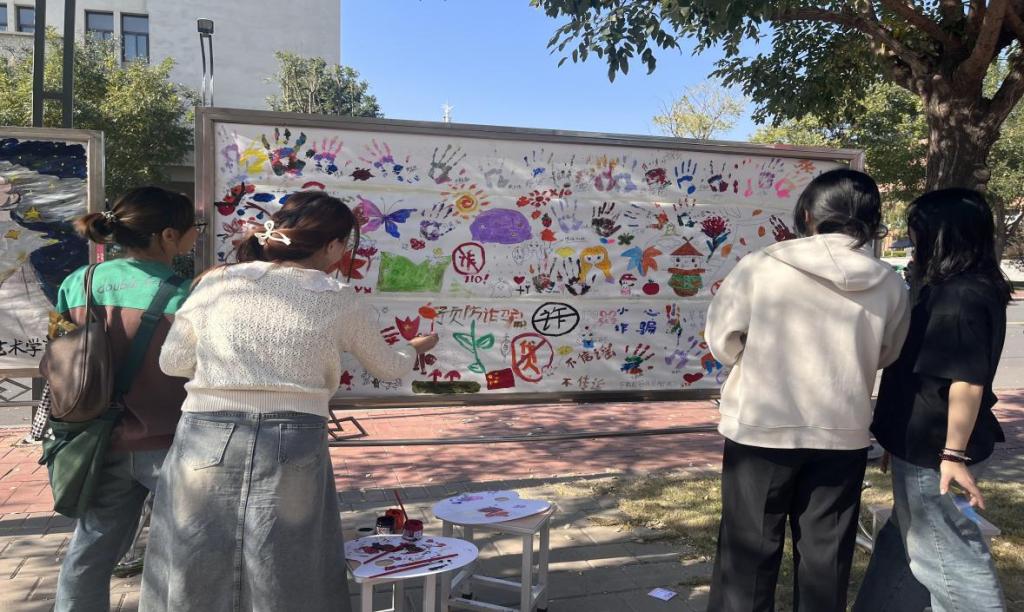 本次活动面向全校学生,旨在以非语言的沟通方式,以涂鸦的形式提升学生潜意识能力为目标。活动主要分为三个步骤,第一步,同学们用不同颜色的颜料进行盖手印,在手印旁边写下自己的名字。第二步,同学们可以发挥想象,画下由“秋”想到的内容或事物。第三步,双十一将至,为谨防电信网络诈骗,同学们可以发散思维画下相关防范图画或心灵漫画,提高学生反诈防骗的能力。