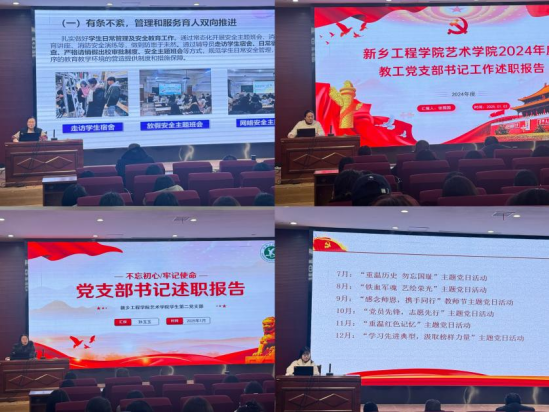 教师们依次上台进行工作汇报。分别从教研室、教学、科研、实验室、党建、学生、行政方面,详细汇报了各自部门及个人的工作情况和取得的成果。其中,不少汇报内容亮点纷呈,展现了艺术学院在教育教学和艺术创作方面的独特魅力和深厚底蕴。