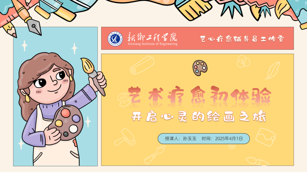 本学期艺术学院艺心疗愈辅导员工作室开设了为期十周的绘画系列课程,由艺术学院陈玄、孙玉玉和信息工程学院张雨潇三位辅导员老师共同授课。第一周艺术疗愈初体验课程于2025年4月1日在学院楼A112成功举办。本次课程由孙玉玉老师担任授课教师,课程内容丰富且极具启发性,为学员们开启了艺术疗愈的探索之旅。
