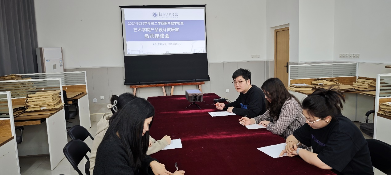2025年4月16日中午,艺术学院产品设计教研室于学院楼A112办公室召开2024-2025学年第二学期期中教学检查教师座谈会。会议由教研室主任赵子淇主持,教研室教师于瑞、郭富菊、张琬仪、兰亚珍共同参与,会议围绕本学期期中教学检查工作展开部署。