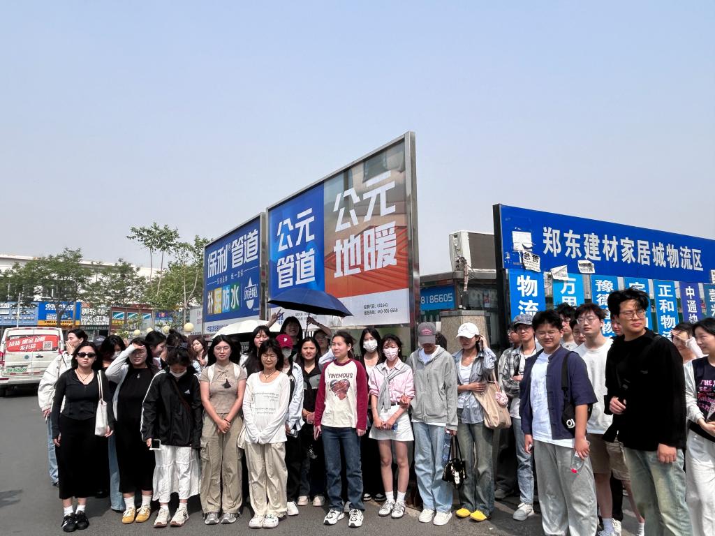 最后一站,学生们来到了郑州东建材市场,此处汇集了各类建筑装饰材料,是环境设计专业学生了解市场主流材料、掌握材料特性的重要实践场所。学生通过走访市场不同区域,记录各类室内装饰材料的种类、品牌、价格及展示方式。在与建材商家交流的过程中,了解材料特性、施工工艺、市场趋势及客户需求。观察市场内的样板间或材料应用实例,学习不同材料在空间设计中的搭配方式,为今后的设计方案提供了更多可行性参考。