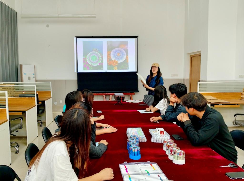 活动伊始,轻柔舒缓的背景音乐如潺潺溪流,在活动现场缓缓流淌,瞬间营造出静谧而祥和的氛围。张雨潇老师首先向同学们介绍了曼陀罗绘画的深厚渊源、丰富多样的形式以及在艺术疗愈领域的广泛应用。一幅幅风格迥异、独具魅力的曼陀罗作品在大屏幕上依次呈现,或色彩斑斓、热情奔放,或淡雅清新、宁静悠远,瞬间吸引了同学们的目光,激发了大家对曼陀罗绘画的浓厚兴趣。