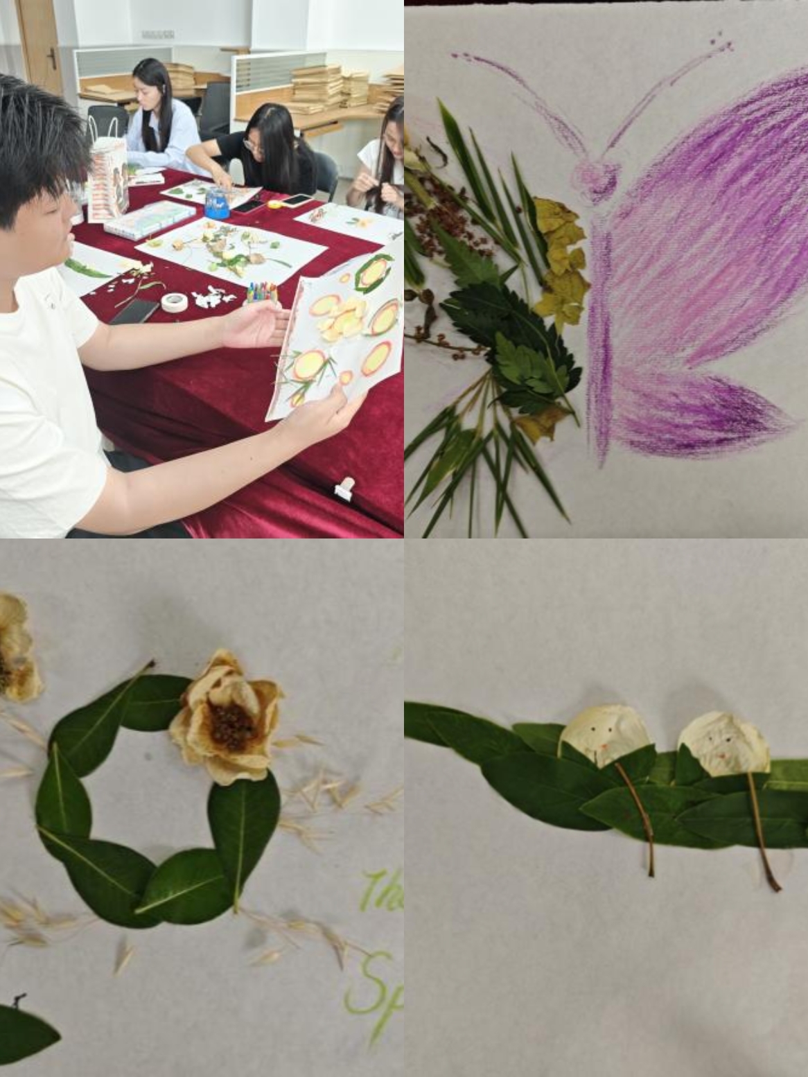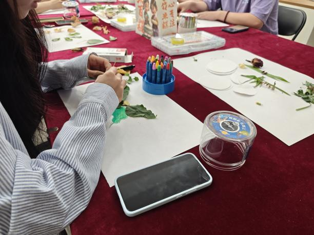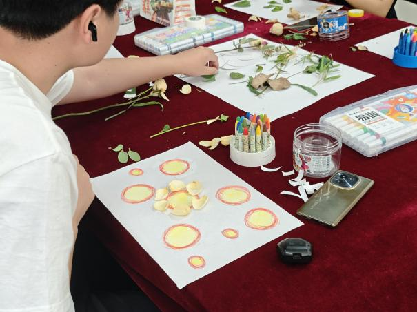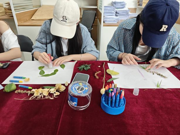 在实践环节,教室里瞬间充满了活力与创意。桌面上摆放着各式各样的植物材料,树叶、树枝、花瓣等,都成为了同学们手中的创作工具。大家结合蜡笔、马克笔等绘画工具,充分发挥想象力,将心中对自然的理解与感悟倾注于作品之中。有的同学以落叶为主体,拼贴出一幅秋日森林的静谧景象;有的用树枝勾勒出山川的轮廓,再用彩色颜料点缀出绚烂的天空;还有的将花瓣精心排列,组成一幅充满生机的花朵图案。在创作过程中,同学们专注而投入,仿佛忘却了外界的烦恼,全身心地沉浸在与自然对话、与艺术交融的美好时光里。