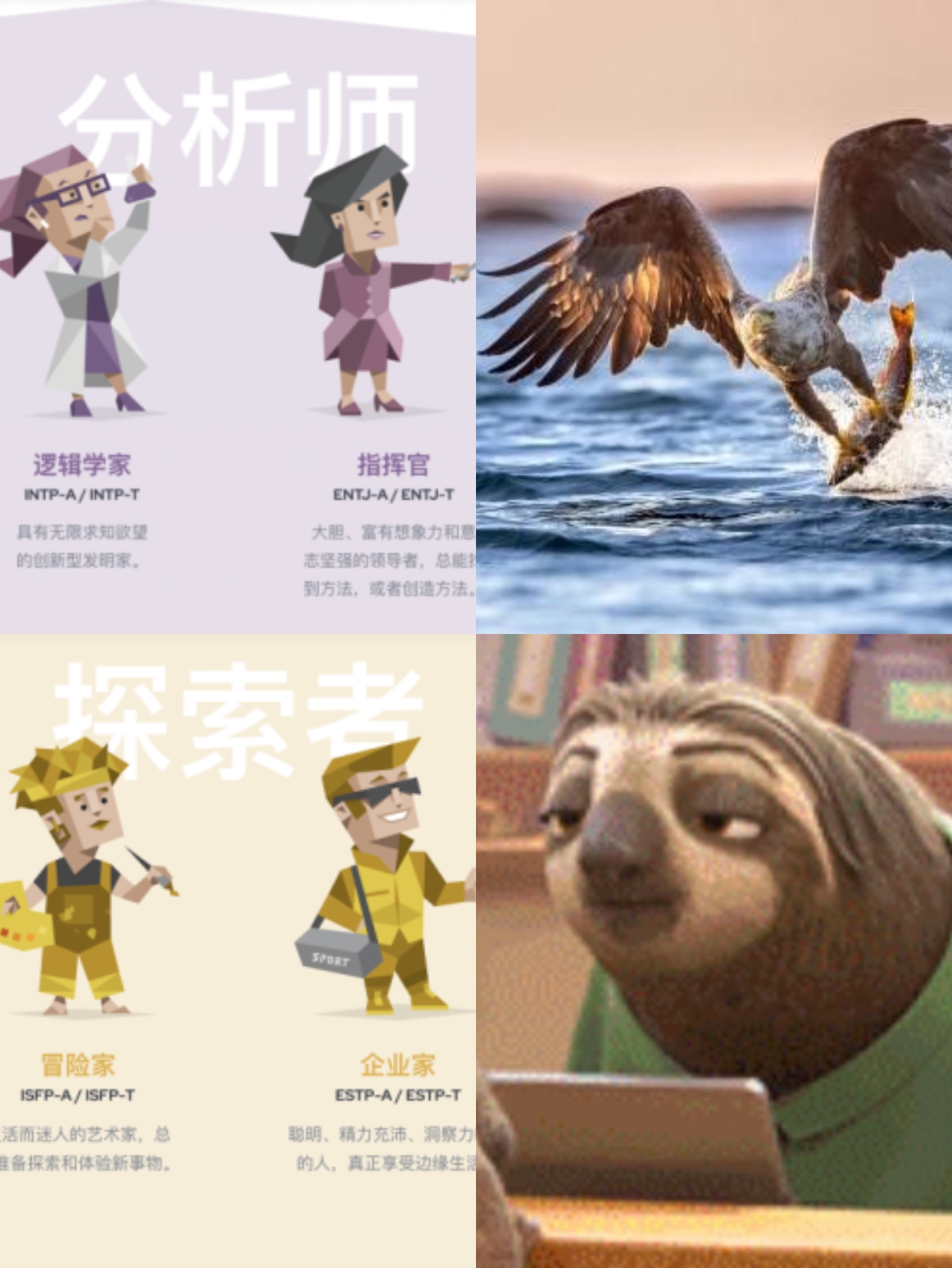 第三环节“MBTI人格与图腾衍化”,巧妙搭建起现代心理学与图腾文化的桥梁。孙玉玉以MBTI16型人格分类为基础,从紫人组、黄人组、绿人组、蓝人组四类出发,分析了不同人格对应的动物象征——如紫色人格中的INTJ可以以鹰代表,鹰的独立、冷静和战略思维与INTJ人格如出一辙;黄色人格ISTP的代表螳螂虾,以独立和实用主义著称,喜欢直接行动而非漫谈等等;ISFP代表树懒,注重内心的感受和价值观,向往和平氛围,这种跨学科的解读方式,让抽象的人格类型变得生动可感。