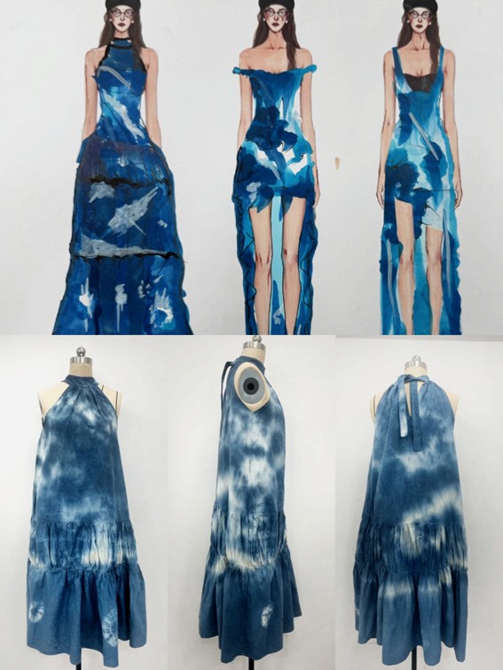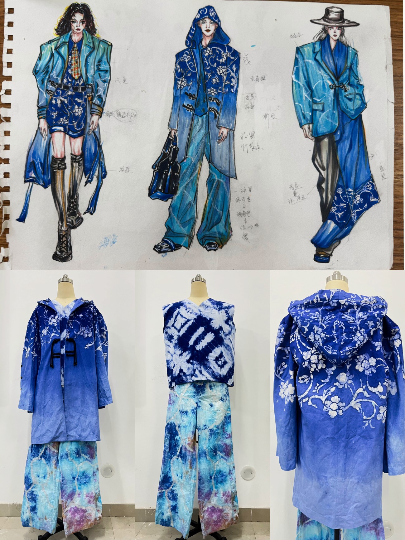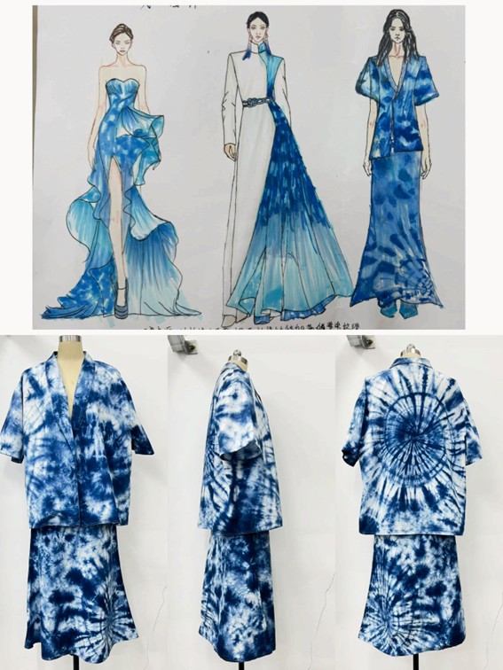 在课程学习过程中,学生们系统地掌握了扎染、蜡染所需的各类工具、染料以及多样化的染色方法,并熟练运用实际操作技法,巧妙地将传统工艺与现代设计理念相融合。通过一系列精心设计的实践内容,学生们深入理解了工艺原理,真切感受到了扎染、蜡染所蕴含的独特美学价值,从而创作出既具有浓郁民间传统风格,又兼具现代时尚气息的手工印染作品。