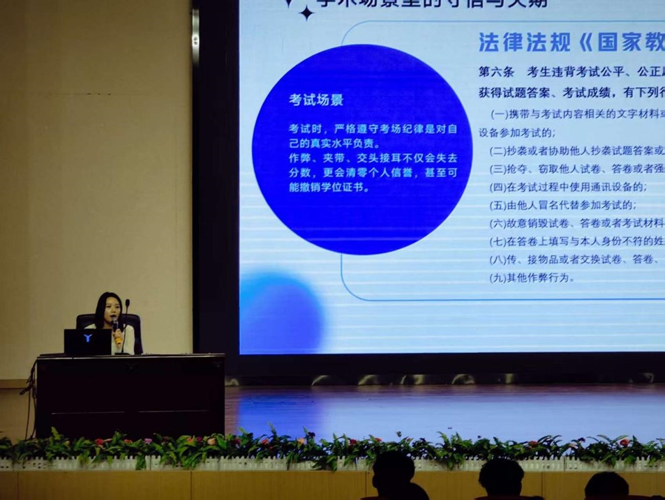 以“诚信感恩、筑梦起航”为主题,武永芳老师围绕考试场景详细解读《国家教育考试违规处理办法》,强调诚信考试是对自身真实水平的负责,警示新生切勿因作弊等行为丢失分数、归零信誉,甚至面临撤销学位证书的严重后果。