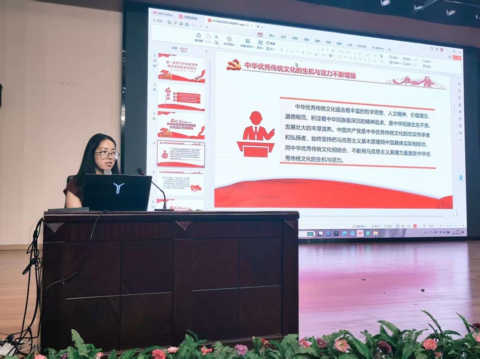 傅婷老师带领新生学习中华优秀传统文化,指出其蕴含丰富哲学思想与人文精神,是中华民族发展壮大的丰厚滋养,鼓励新生从中汲取养分,增强文化自信。