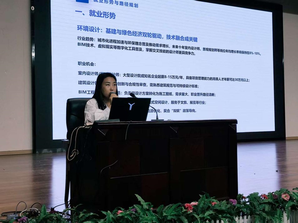 聚焦大学生就业形势与路径规划,盖利华老师以环境设计专业为例,分析城市化进程与环保理念驱动下的行业趋势,介绍室内设计师、建筑设计师等职业机会及薪资水平,为新生职业发展指引方向。