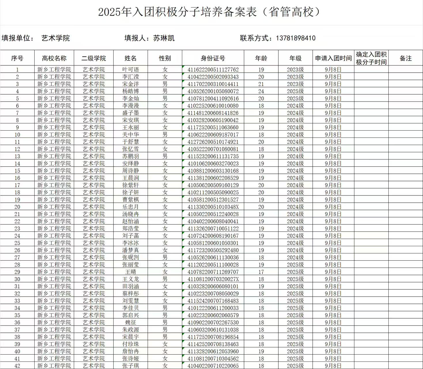 根据共青团河南省委组织部相关工作要求及学校团委《关于规范团员发展与入团积极分子培养工作的实施办法》文件精神,经学生本人申请、各团支部民主评议、院团委考察审核,现将艺术学院2025年入团积极分子名单予以公示。