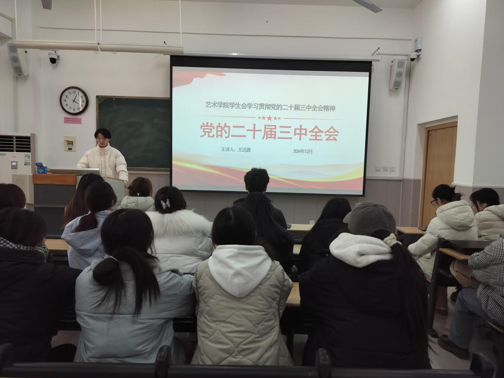 为深入学习和贯彻党的二十届三中全会的精神,加强对艺术学院学生会成员的政治教育和国情教育,12月26日下午,艺术学院学生会在学院楼A213召开了以“学习党的二十届三中全会精神”为主题的专题学习会。本次会议由学生会办公室主任王达源主持,学生会全体成员参加。