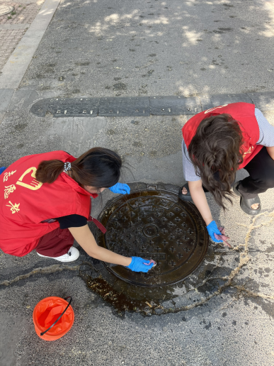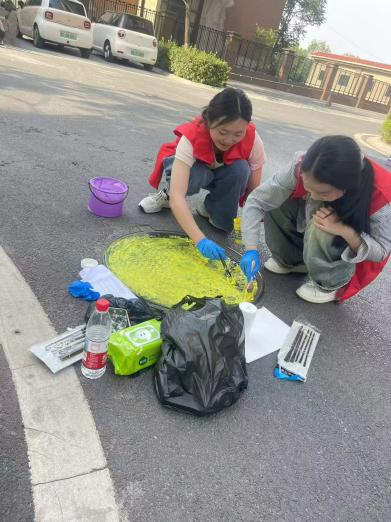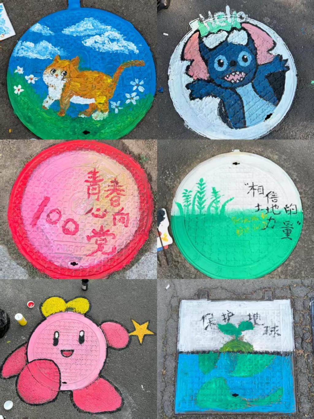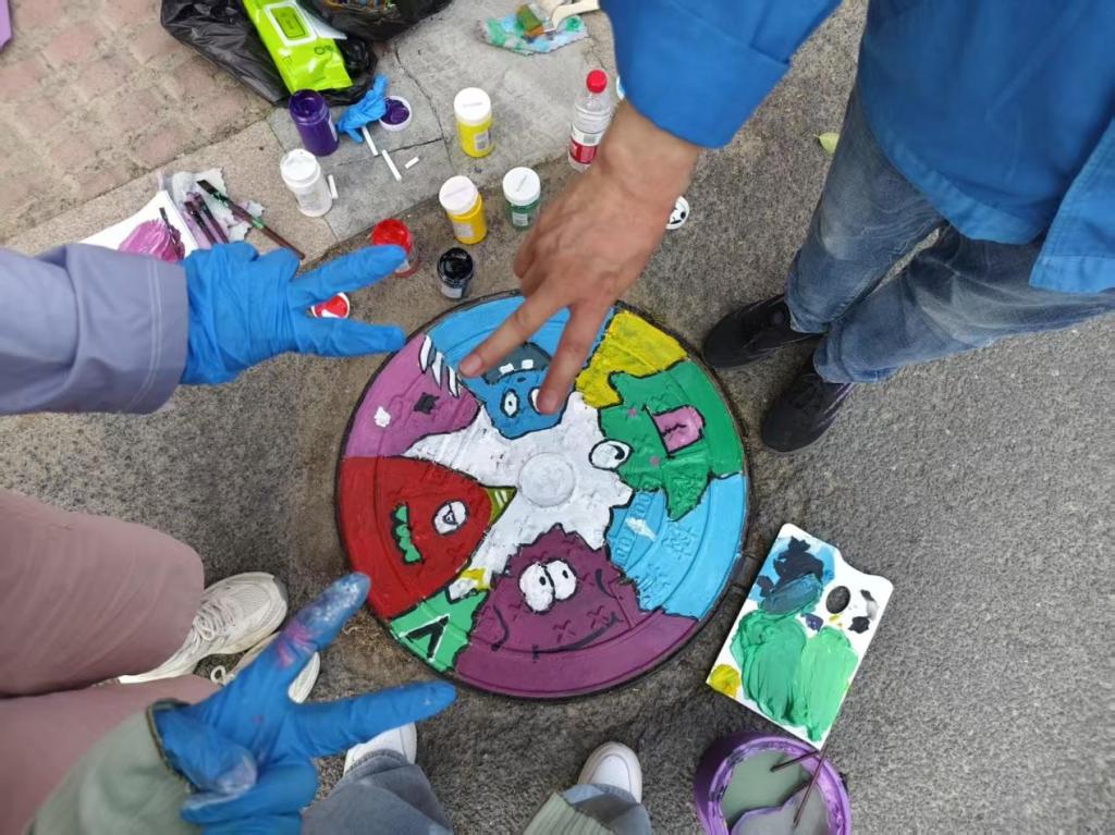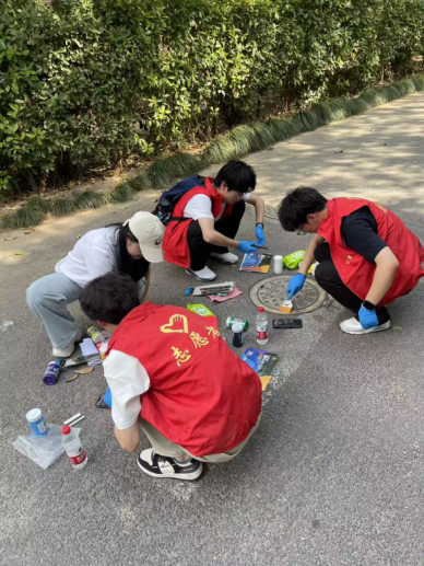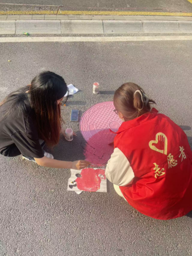 活动现场,党员以及我们32期的发展对象们身着鲜艳的红色志愿者服装,热情高涨地投入到小区美化的活动中。他们手持画笔、颜料等工具,专注地为小区内的井盖等设施进行创意涂鸦。在他们的巧手下,原本单调的井盖逐渐变得色彩斑斓,一幅幅生动有趣的图案不仅为校园增添了艺术气息,更成为小区里一道道独特的风景线。
