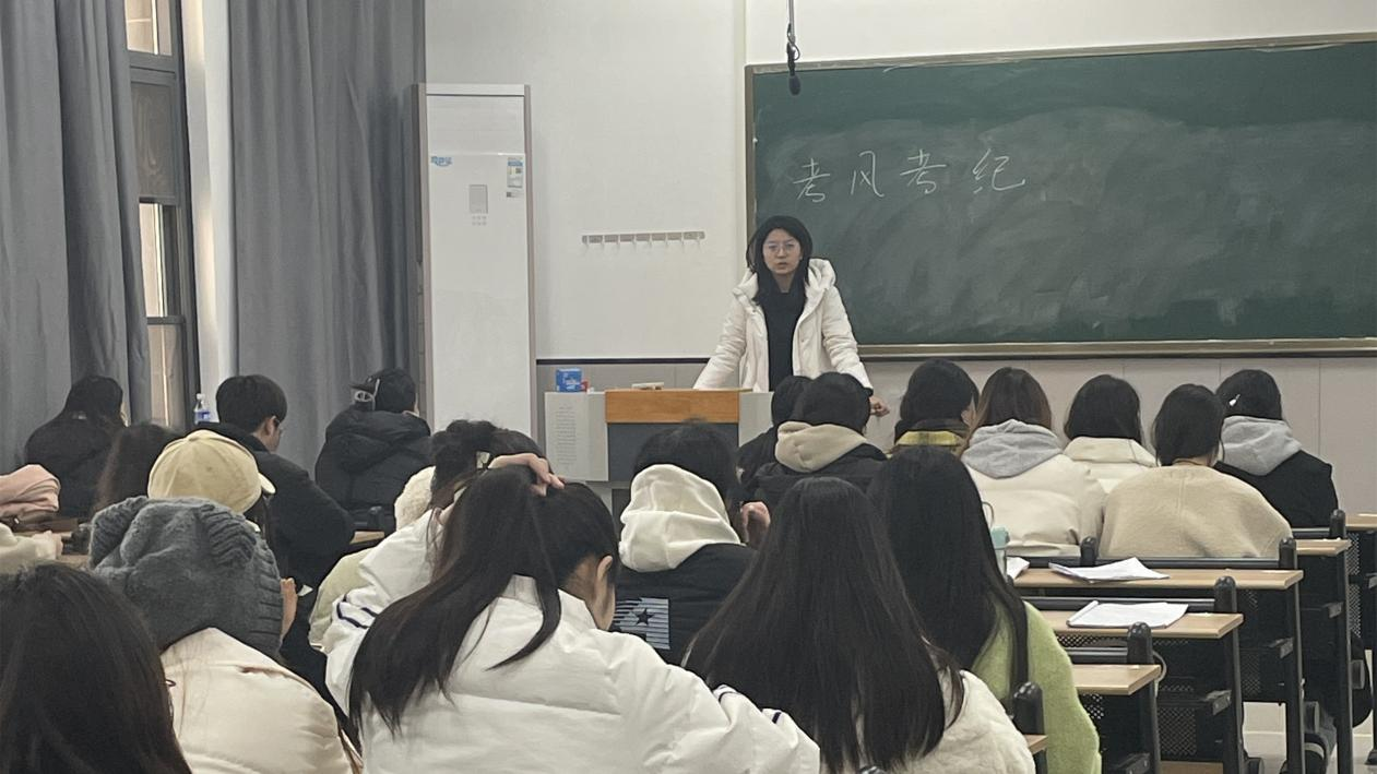 张静同志宣读诚信考试倡议书,她呼吁同学们端正态度,积极备考;严于律己,诚信应考;文明考风,诚实守纪。自觉端正考风考纪,诚信对待每一场考试,弘扬诚信精神,将党纪学习落到实处。