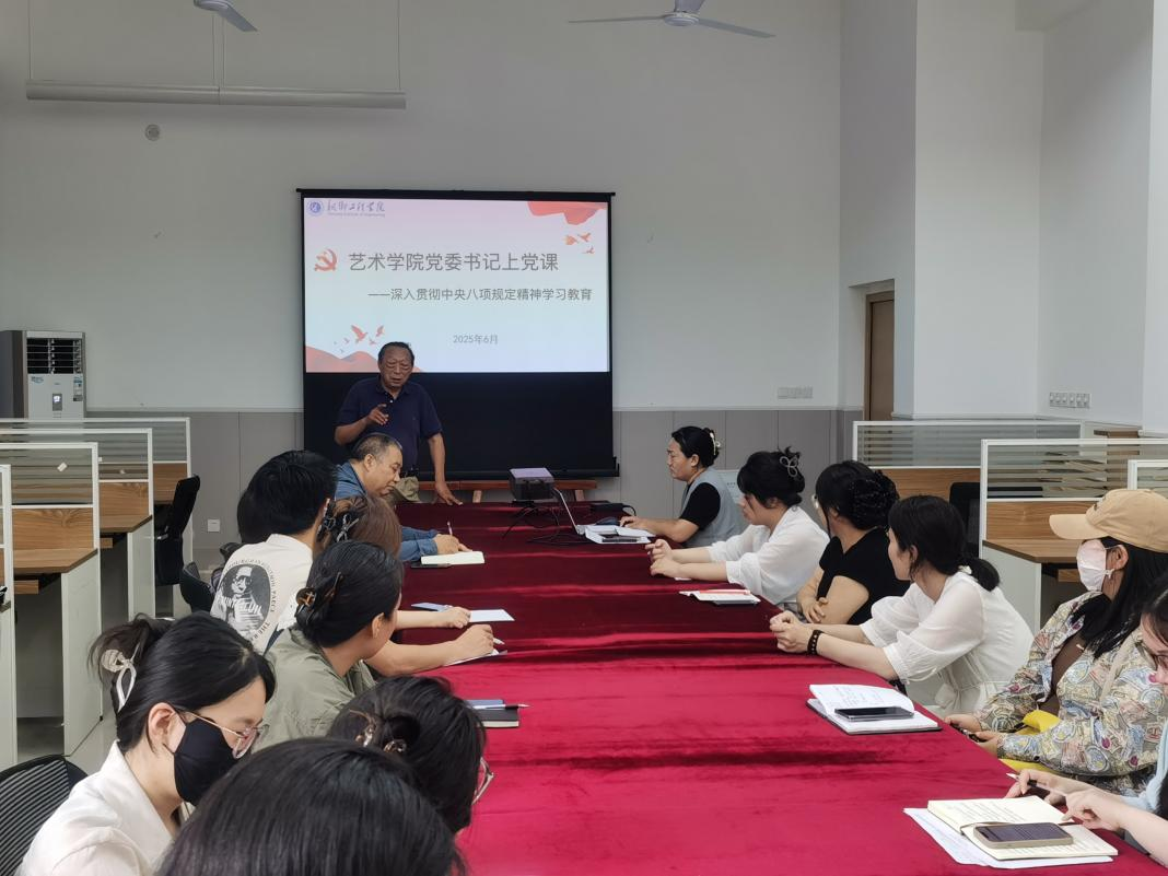 为进一步强化教工党员作风建设,筑牢纪律规矩意识,6月19日,艺术学院党委书记张建伟以《深入贯彻中央八项规定精神学习教育》为题,为全院教工党员讲授专题党课。学院党委班子成员、各党支部书记、师生党员代表参加学习。