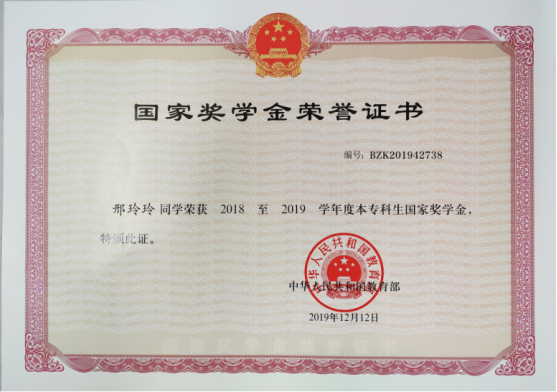 化工162班邢玲玲同学获得国家奖学金