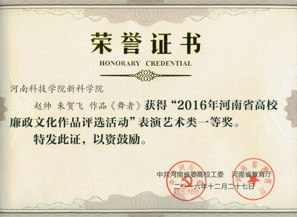 近日,收到河南省教育厅联合发布《关于公布全省高校廉政文化作品评选结果的通知》(教思政〔2016〕2019号)文件,我系园林131班赵帅获得“2016年河南省高校廉政文化作品评选活动‘表演艺术类一等奖’”荣誉称号。