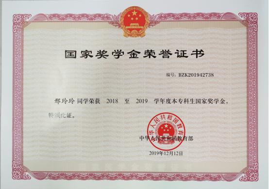 近日,2018-2019学年度国家奖学金荣誉证书下发,热烈祝贺我系化学工程与工艺专业162班邢玲玲同学获此殊荣。
