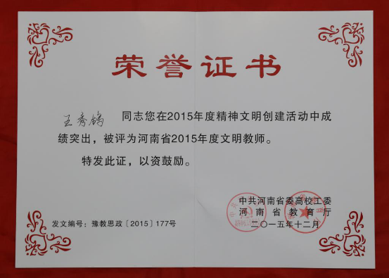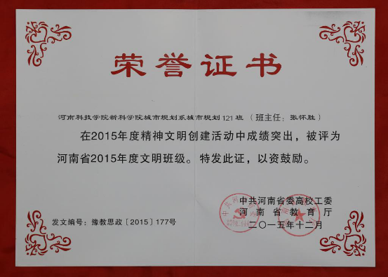 近日,中共河南省委高校工委 、河南省教育厅联合发布《关于表彰2015年度精神文明建设先进集体和先进个人的决定》(豫教思政〔2015〕177号)文件,我系城市规划121班荣获“文明班级”荣誉称号,系主任王秀鸽获得“文明教师”荣誉称号。