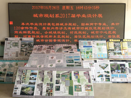 本次毕业设计展作品共计120余件作品,是2013级城乡规划、园林学生设计制作,展板内容涉及城市旧城改造规划设计、商业街区规划、小城镇规划、村庄规划、城市中心区规划、河南科技学院新东区规划、居住区规划设计、居住区景观设计、城市公园景观设计、农业观光园设计等。