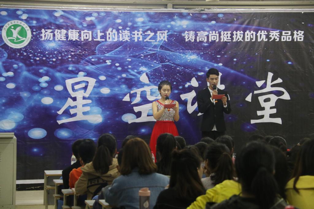 本次活动分为四个环节:我听、我看、我讲、我议。星空讲堂在2016级两位学生代表的歌曲《追梦赤子心》中拉开了帷幕。随后,大家共同观看了俞敏洪的励志视频《相信奋斗的力量》,他气势恢宏、激情澎湃的演讲使同学们深刻意识到拼搏、奋斗的力量;接着,高年级两名优秀学生干部做励志发言,她们用执着拼搏的奋斗精神恪守着自己的诺言、坚守着自己的信仰。王秀鸽主任通过讲述《匡衡凿壁》、《悬梁刺股》、《牛角挂书》、《囊萤映雪》等古代励志故事激励同学们要不畏艰难,刻苦学习,通过列举“孟母三迁”、“陶母截发”、“岳母刺字”、“欧母以荻画地”等经典实例告知同学们做人的格局,她以形象生动的经典文化故事教育鼓励同学们如何做到励志、修身,她用自己的实际行动诠释了“润物细无声,育人于无形”。最后,在“我议”环节,由大一新生代表做讨论发言,畅谈了自己对励志修身的感悟。