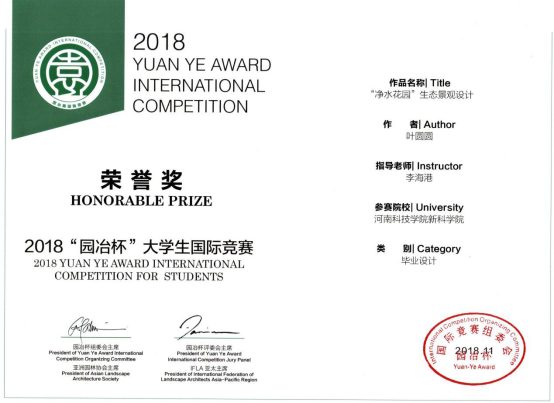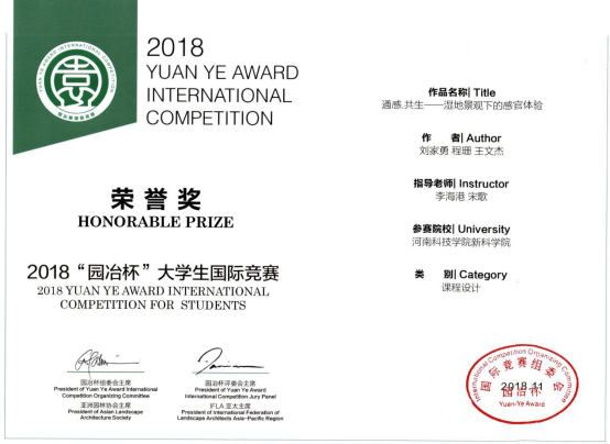 其中,由我系教师李海港指导的园林专业学生叶圆圆作品《“净水花园”生态景观设计》获毕业设计类竞赛荣誉奖;李海港、宋歌两位老师指导的园林专业学生刘家勇、程珊、王文杰作品《通感·共生——湿地景观下的感官体验》获课程设计类竞赛荣誉奖;我系被组委会授予先进教育集体奖。