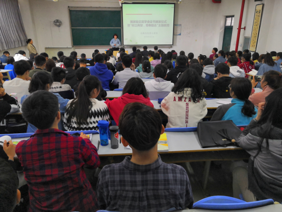 为了树典范、促学风,激发学生学习积极性,生化系于2019年4月3日上午在12号教学楼合四教室举行国家励志奖学金证书颁发仪式暨“树立典型,青春励志”主题教育活动。生化系思政专干邱月盈、教学副主任曲黎、行政副主任晋跃栋、资助专管员黄世江、辅导员郭中甲以及大一、大二学生代表近200人参加此次会议,会议由邱月盈主持。