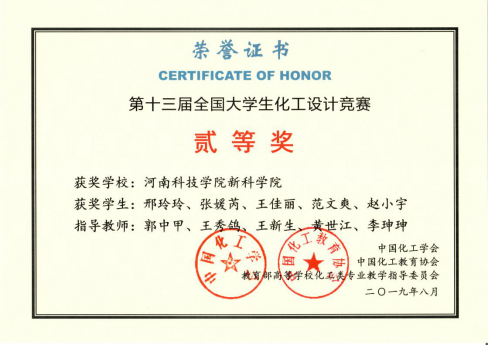 全国大学生化工设计竞赛是由中国化工学会、中国化工教育协会、教育部高等学校化工类专业教学指导委员会举办的,是目前全国高校化工专业级别最高、参赛队伍最多、影响力最大的年度大赛,已成为高校培养学生综合素质、创新思维和工程能力的重要推动力量和第二课堂。今年竞赛题目为“醋酸乙烯酯生产分厂的设计或改造”,全国共有357所学校2196支团队报名参赛。自3月确定任务、组队报名,到7月作品完成,所有队员和指导老师全力以赴,最终完成作品“兖矿国泰化工分厂年产5万吨醋酸乙烯酯项目”,充分展示了河南科技学院新科学院化工学子的工程能力、创新能力和团队协作精神。