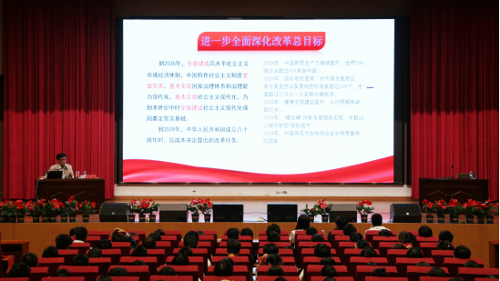 赵一鹏指出党的二十届三中全会是在我国迈向全面建设社会主义现代化国家新征程、向第二个百年奋斗目标进军的关键时刻召开的一次十分重要的会议。他从“进一步深化改革总目标”、“全面深化改革的目标导向”、“全面深化改革必须遵循的重大原则”、“教育科技人才领域重点改革任务”等四个方面对二十届三中全会精神进行系统阐释和深入解读,并号召全体同学要树立远大理想和抱负,将个人的成长与国家的命运紧密相连,秉持“知行日新,至善至真”的校训精神,努力成为有理想、有本领、有担当的时代新人,为实现中华民族伟大复兴的中国梦贡献自己的力量。