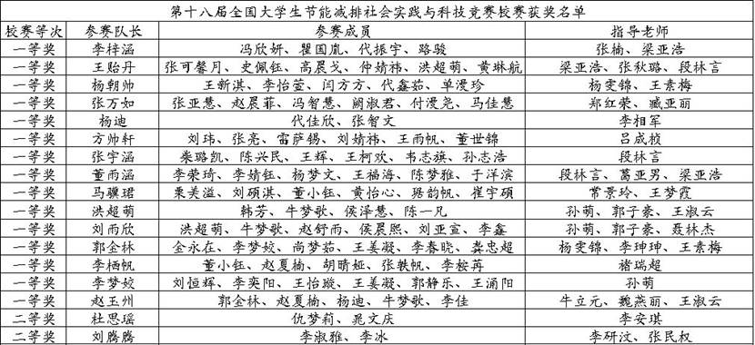 2025年(第十八届)全国大学生节能减排社会实践与科技竞赛(以下简称:“全国大学生节能减排大赛”),由教育部高等教育司主办,生物工程学院本次校赛共有17支队伍获得校赛奖项,(其中经学校评比:共15支队伍获得一等奖,2支队伍获得二等奖)。校赛根据国家赛的评分标准组织评审,现对获奖队伍进行公示。