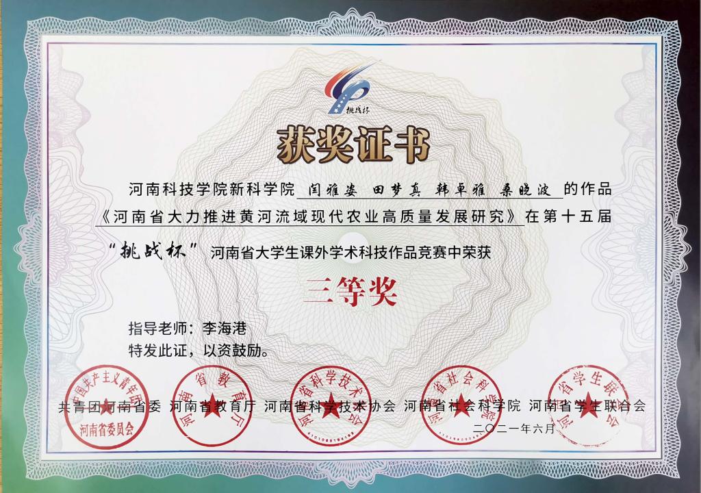 第十五届“挑战杯”河南省大学生课外学术科技作品竞赛三等奖