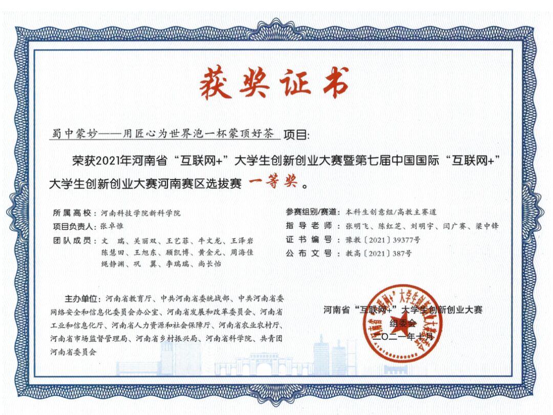 2021年河南省“互联网+”大学生创新创业大赛暨第七届中国国际“互联网+”大学生创新创业大赛河南赛区选拔赛一等奖