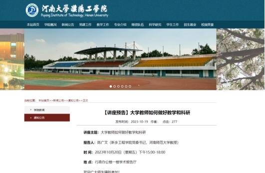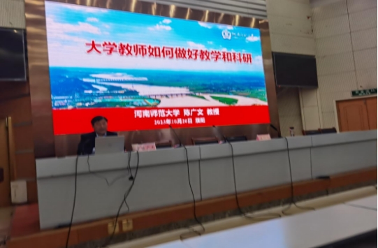 2023年10月20日下午,陈广文教授应邀为河南大学濮阳工学院教职工做教学科研报告,报告主题为“大学教师如何做好教学和科研”。该校各教学院部及处室共200余人到场聆听,报告会由该校郑兆顺副校长主持。