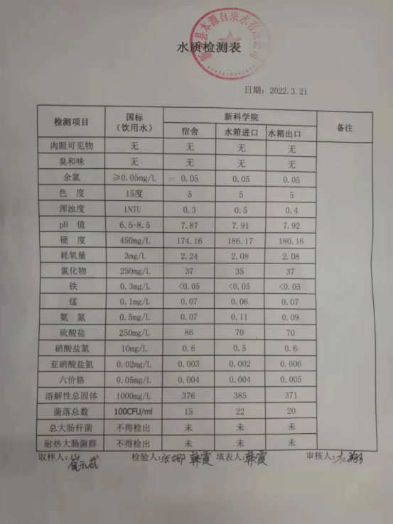 另外,3月19日,我校联合新乡县本源自来水有限公司,对朗公庙市政供水管道进行冲洗、排放管网末梢水;安排生产人员对我校应急泵站进行维护保养,水源井排放,确保时刻达到热备状态。并对冲洗后的管道进行取样检测,结果符合国家生活饮用水卫生标准,未发现异常现象。