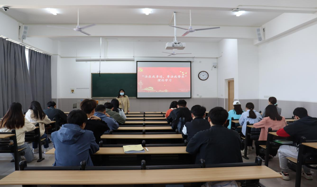 为深入开展法治教育宣传活动,增强同学们尊法守法的意识,永利23411集团官网文法学院第四党支部于4月19日上午在学院楼1-B214教室召开了“法在我身边,尊法我带头”理论学习活动,本次活动由文法学院第四党支部书记王玉玮主持召开,文法学院第四党支部全体学生党员参加。
