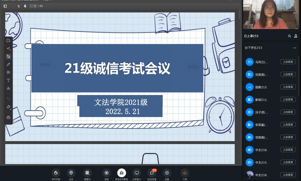 临近期末,为加强学院学风建设,端正学生学习态度,加强考风考纪教育,2022年5月21日晚,文法学院21级开展钉钉线上诚信考试专题教育,本次专题教育由21级辅导员李婉鑫老师主讲,21级学生参加。