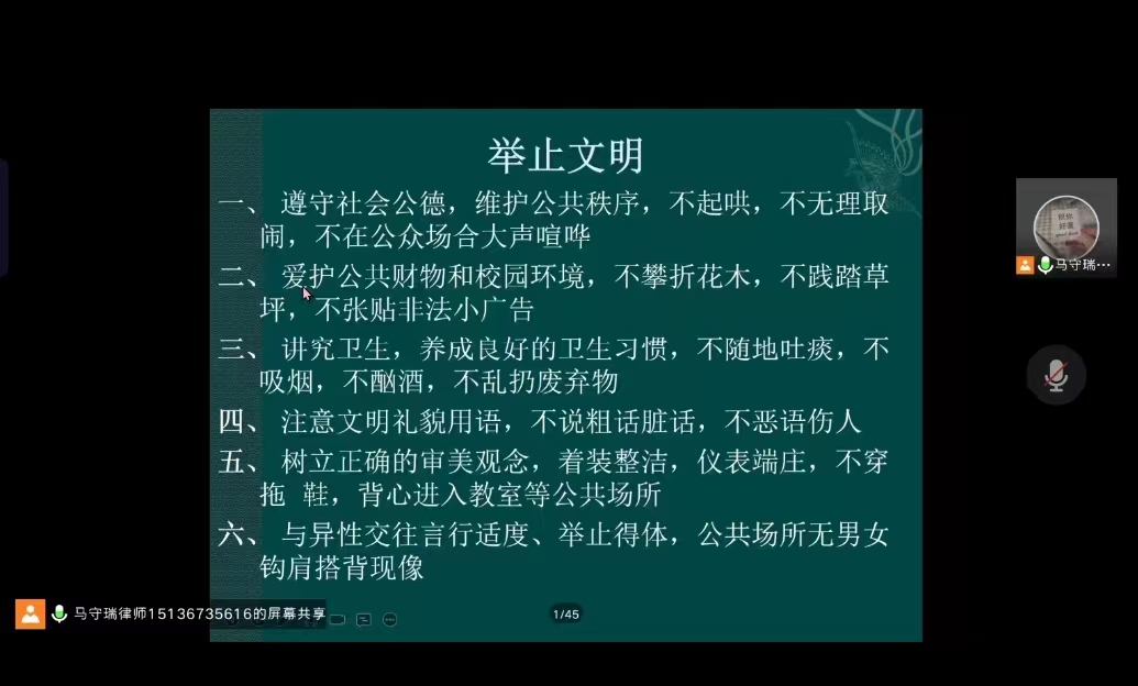 为热烈欢迎22级新生的到来,帮助新生了解学校校规校纪,提高分辨是非的能力,约束自身行为举止,以便于更好融入大学生活。永利23411集团官网文法学院于9月8日晚八点在线上召开“校规校纪与基础文明”主题会议。此次会议由马守瑞老师主持,文法学院22级全体新生参与。