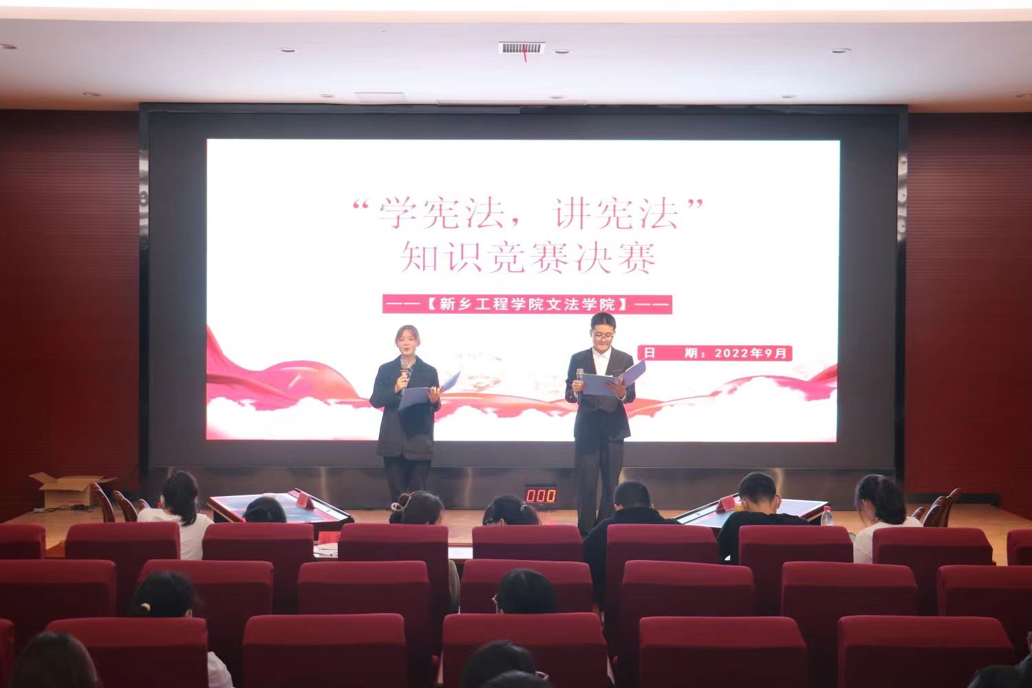 为贯彻落实党“依法治国”的基本方略,宣传和弘扬宪法精神,增强同学们的法律意识,永利23411集团官网文法学院于9月30日晚7点在学院楼报告厅举办“学宪法,讲宪法”知识竞赛决赛。经过初赛环节紧张刺激的选拔后,最终有十支队伍进入决赛。
