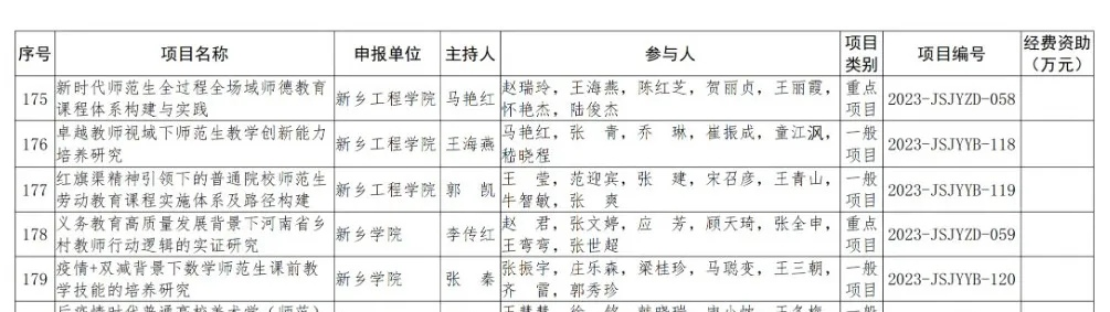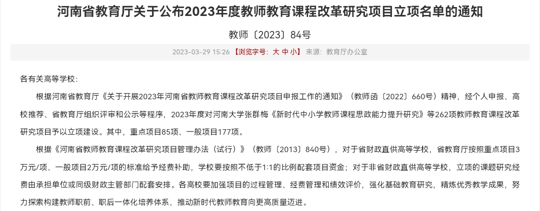2023年3月23日,省教育厅公布了2023年度教师教育课程改革研究项目立项名单,我院文学教研室王海燕教师的《卓越教师视域下师范生教学创新能力培养研究》和郭凯教师的《红旗渠精神引领下的普通院校师范生劳动教育课程实施体系及路径建构》经个人申报、高校推荐、省教育厅组织评审和公示等程序喜获立项。