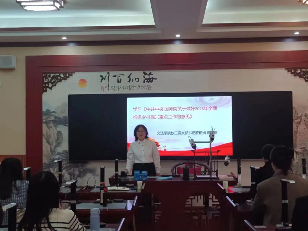 为落实文法学院党政工作,积极响应国家号召,助力乡村振兴,文法学院党支部于4月13日在学院楼B319书法室开展学习《中共中央国务院关于做好 2023 年全面推进乡村振兴重点工作的意见》专题党课。本次党课由文法学院教工党支部书记罗艳娟讲授,全体教工党员参加学习。