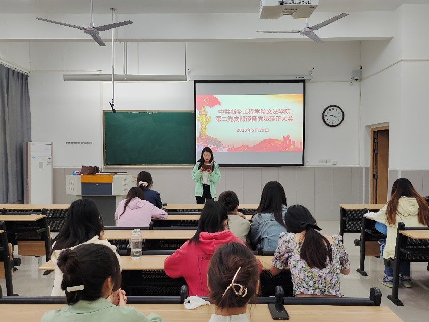 本次会议由支部书记李婉鑫同志主持召开,参加此次会议的有文法学院第二党支部的所有党员、预备党员同志。会议严格按照党组织预备党员转正程序进行。首先,此次会议按照奏唱国歌,支部书记点名并通报党员与会情况,待转正预备党员宣读转正申请,汇报自己对党的认识、入党动机、平时学习、工作和生活中的情况以及需要向党组织说明的问题,并结合自身实际情况表明今后的学习和工作的态度和决心的议程有序进行;然后,入党介绍人根据上述同志在培养期间的表现,进行了发言,并提出意见。最后,由正式党员采用无记名投票的方式投票表决,一致同意六位同志的转正申请。