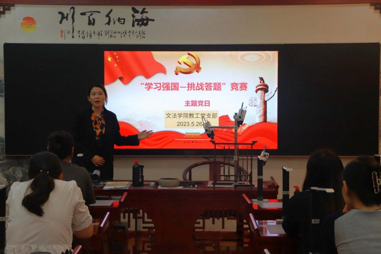 为深入学习贯彻习近平新时代中国特色社会主义思想和党的二十大精神,引导新一代青年教师在学思践悟中坚定理想信念、在奋发有为中践行初心使命,文法学院于5月26日在学院楼B319召开以“‘学习强国’进校园,争做强国好青年”为主题的“学习强国—挑战答题”竞赛主题活动。本次活动由徐梓滢老师主持,文法学院教工支部党员教师参与活动答题。