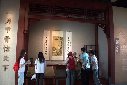 7月5日实践团队走过字坊,通向展馆前的开阔的广场,广场两旁是青铜甲骨片组成的碑林,有殷商时期最具代表性的两种元素——甲骨文和青铜器。来到大厅,环顾大厅四周,四块白色浮雕围绕,气势磅礴。大厅顶部采用穹庐顶的样式。北面浮雕介绍了中国文字发展简史,南面则是一片甲骨惊天下,东面的是中国书法简史,西面的是少数民族语言文字。汉字作为记录汉语的符号系统,以强大的超方言性、缜密的构形体系、精妙的义理逻辑和鲜明的审美内涵而著称于世。团队成员通过荟萃历代中国文字样本精华,细细地参观并品味着中国文字的构形特征和演化历程,了解中国文字千年的传承,了解各少数民族文字的特色和发展,了解承载文字的技术和载体的差异。