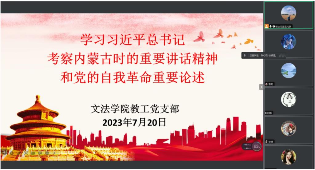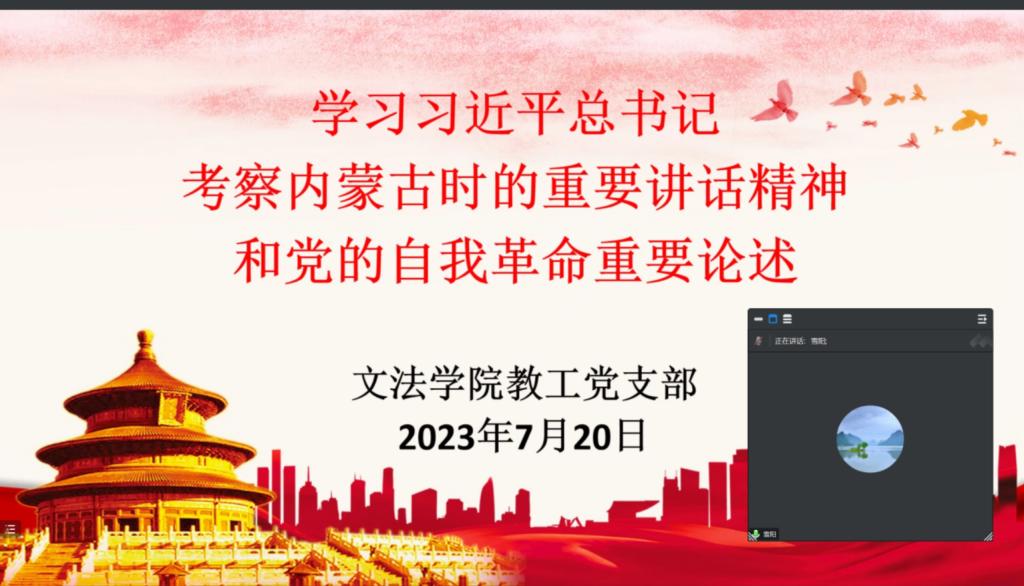 为推进学习贯彻习近平新时代中国特色社会主义思想主题教育深入发展,7月20日文法学院教工党支部围绕习近平总书记在听取内蒙古自治区党委和政府工作汇报时重要讲话精神和关于党的自我革命重要论述开展集体学习,会议由宣传委员徐梓滢主持,文法学院教工党支部全体教工党员参加。