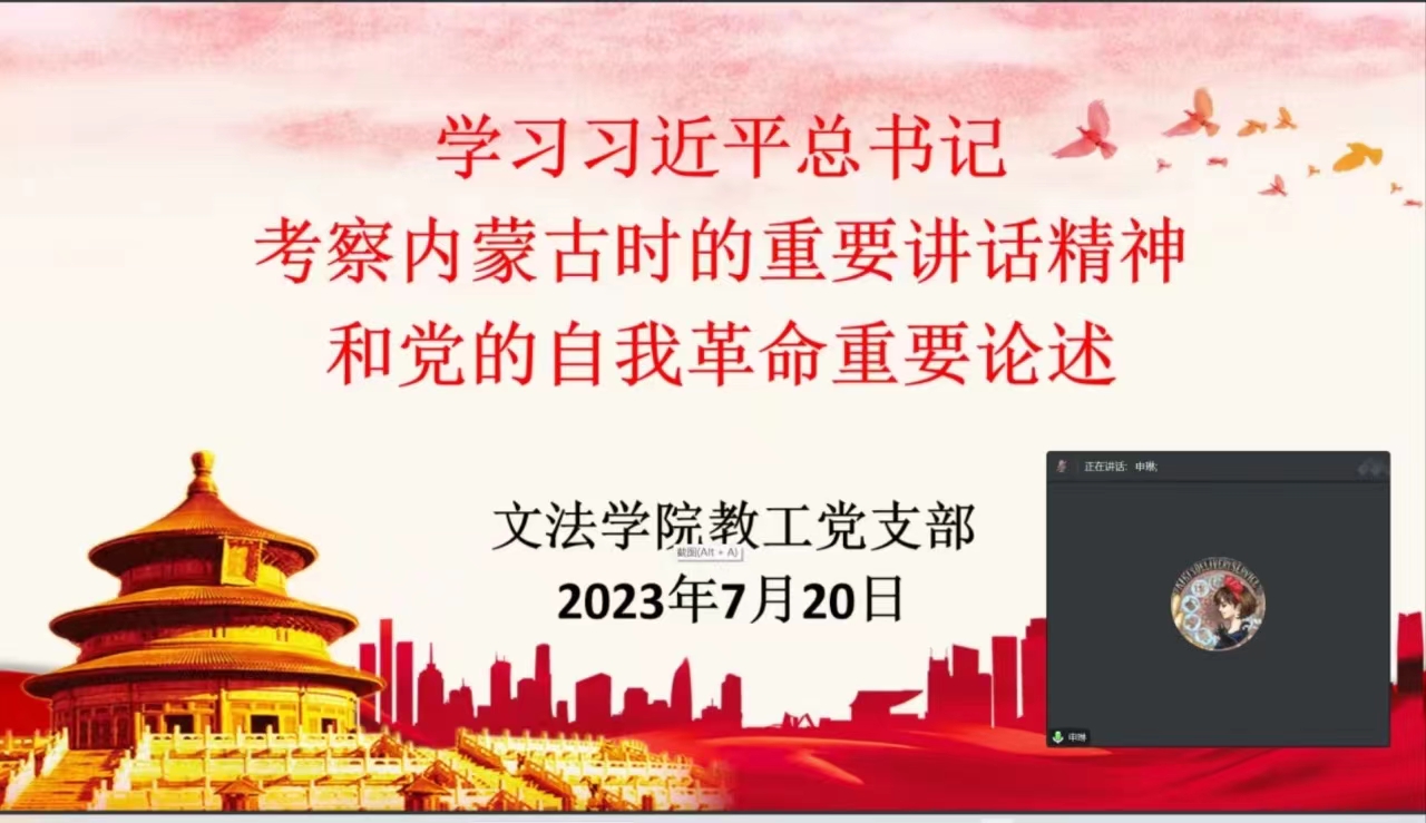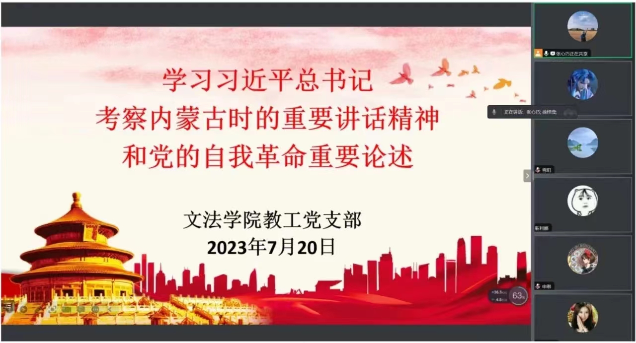 为推进学习贯彻习近平新时代中国特色社会主义思想主题教育深入发展,7月20日文法学院教工党支部围绕习近平总书记在听取内蒙古自治区党委和政府工作汇报时重要讲话精神和关于党的自我革命重要论述开展集体学习,会议由宣传委员徐梓滢主持,我院教工党支部全体教工党员参加。