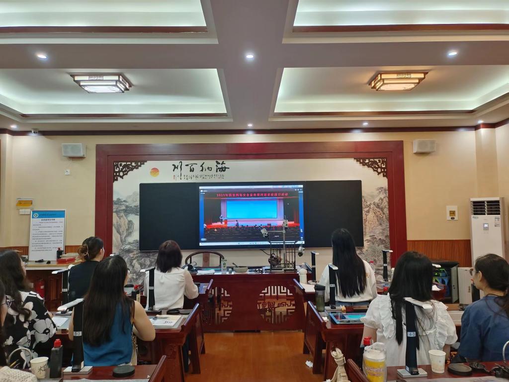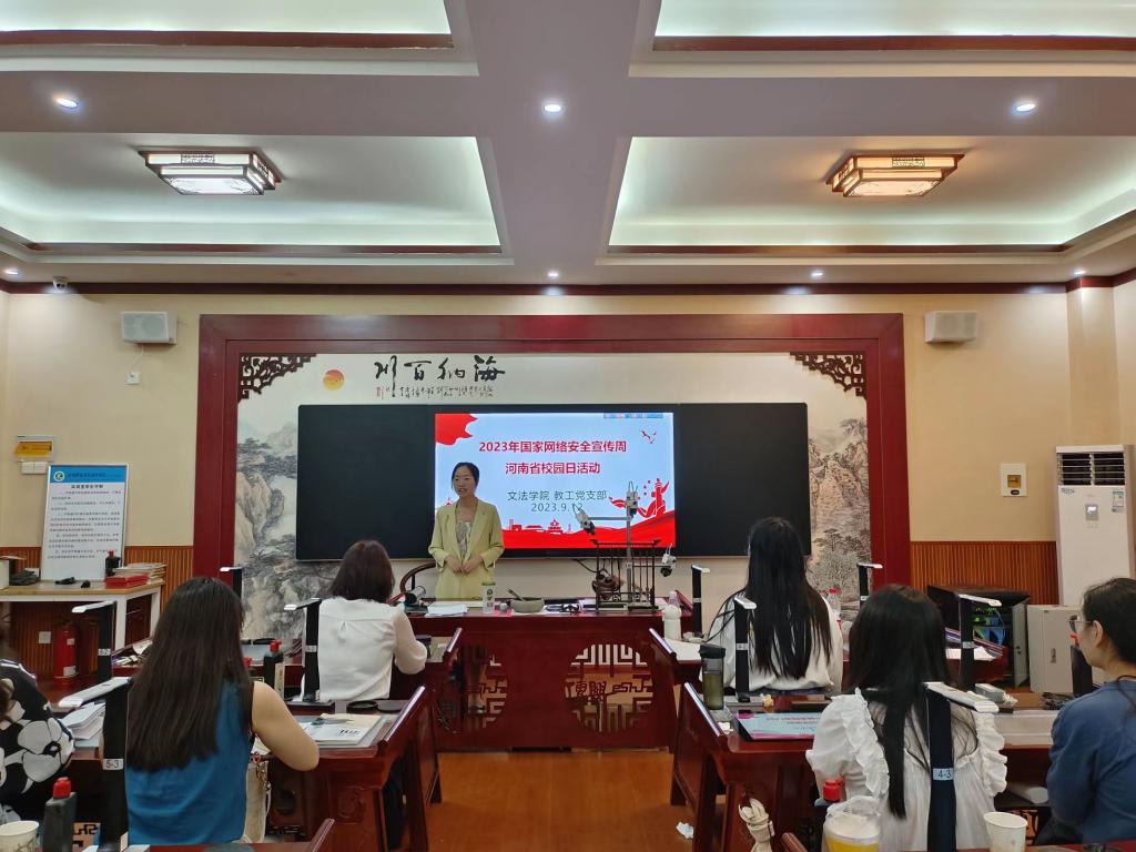 为深入学习宣传贯彻习近平总书记关于教育强国、网络强国的重要思想,宣传贯彻习近平总书记对做好互联网时代的学校思想政治工作和意识形态工作、网络安全工作“四个坚持”的重要指示精神,文法学院于9月12日上午十点在学院楼书法实验室B319集中观看网络安全宣传周启动仪式,本次会议由张心巧老师主持,文法学院教工党支部书记罗艳娟及教工支部全体教师党员出席。