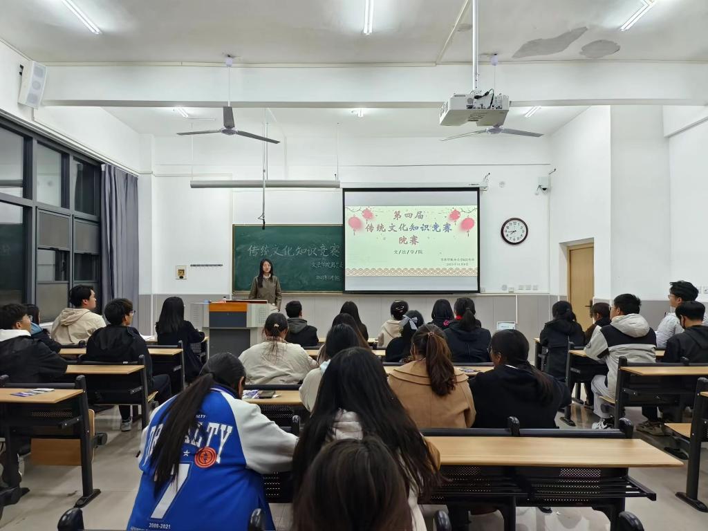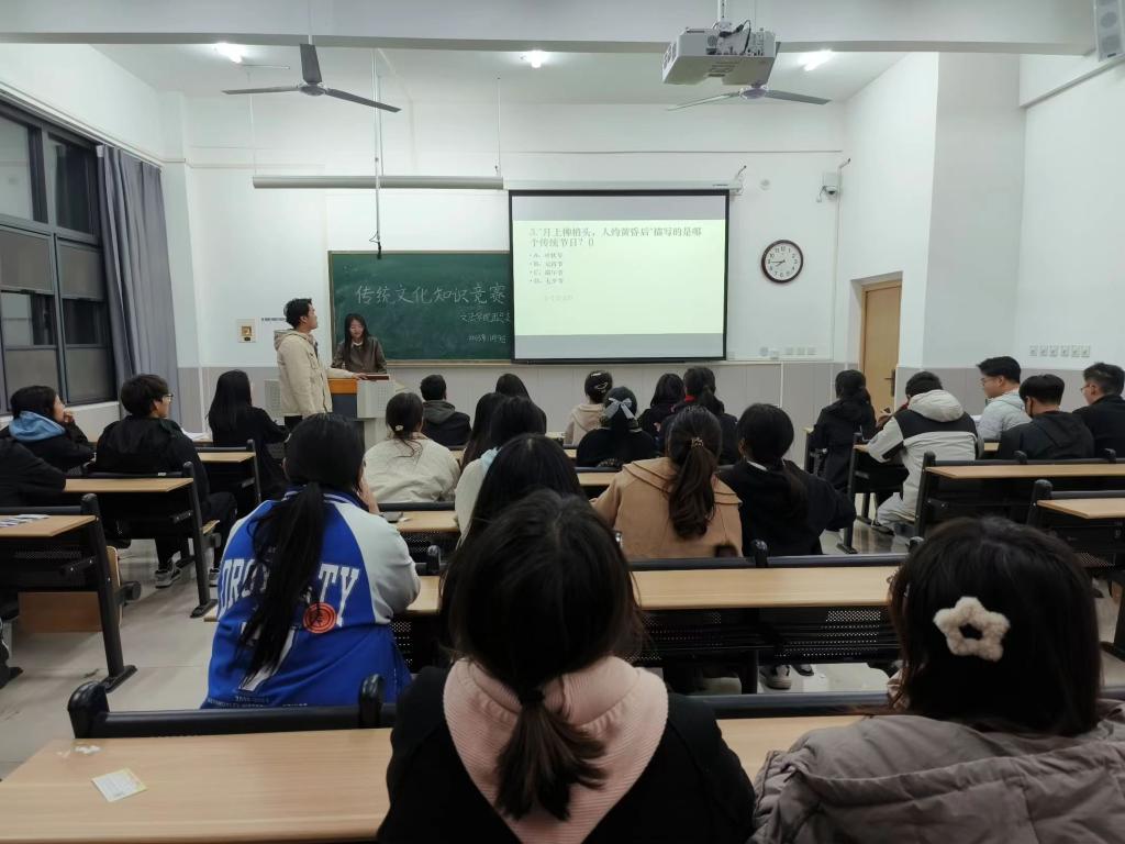 为弘扬中华民族传统文化,坚定文化自信,构建良好的校园文化氛围,文法学院于11月9日晚在学院楼1-B316举办了第四届传统文化知识竞赛,此次竞赛共有10组同学参与。