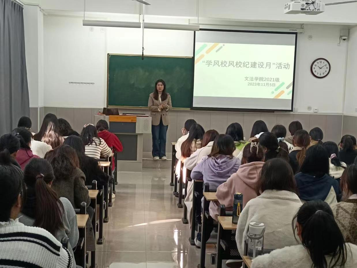 学风建设是高等学校教育永恒的主题,是全面贯彻党的教育方针,是高等学校实现培养目标的重要条件,是衡量办学水平的重要标志。为进一步加强我院学生思想教育和行为管理,引导学生进一步明确学习目标,端正学习态度,强化学习纪律,规范文明行为。我院召开“学风校风校纪建设月”动员大会,大会由各年级辅导员主持,文法学院全体同学参加。